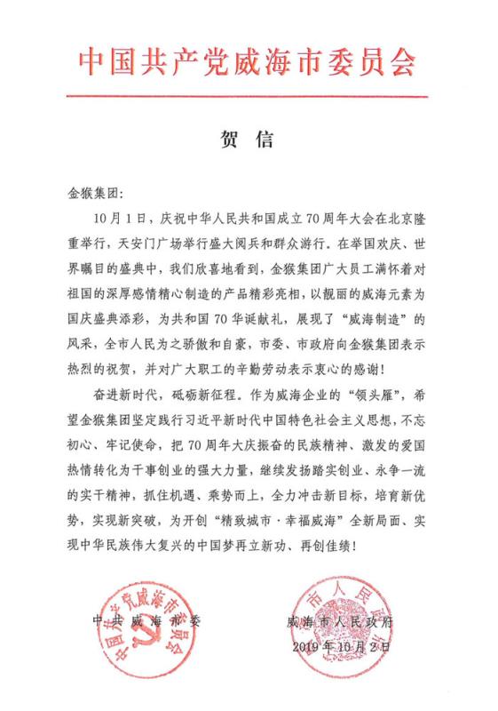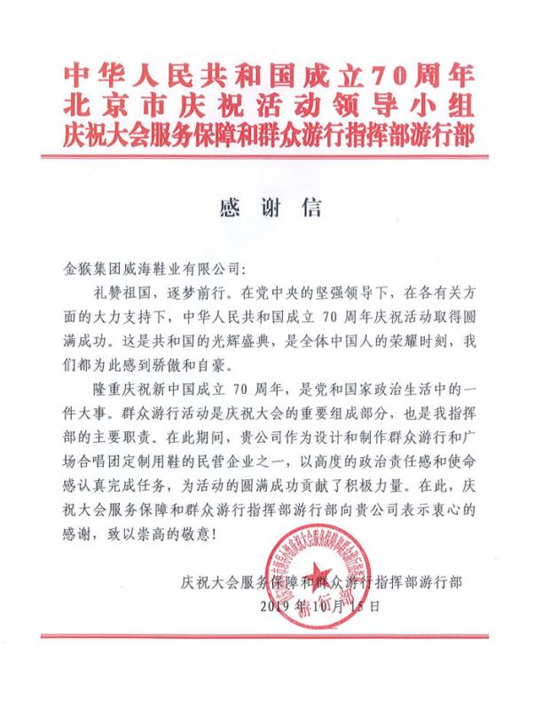 在各级党委、政府的正确领导及各界朋友的关心支持下,金多宝(中国)官方网站 圆满完成了庆祝新中国成立70周年阅兵的保障任务,为威海也为金多宝 自己争了光。