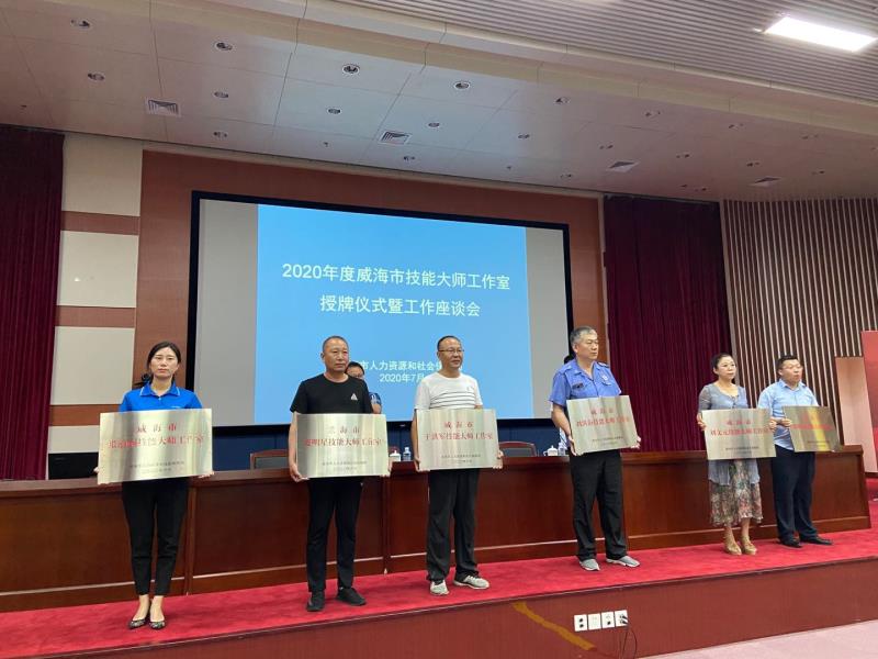 7月31日,2020年度威海市技能大师工作室授牌仪式暨工作室建设工作座谈会在威海市人力资源和社会保障局召开,金多宝 鞋业有限公司张丽丽工作室由威海市示范技师工作站获准变更为威海市技能大师工作室,工作室领办人张丽丽上台接受牌匾并做经验交流发言。