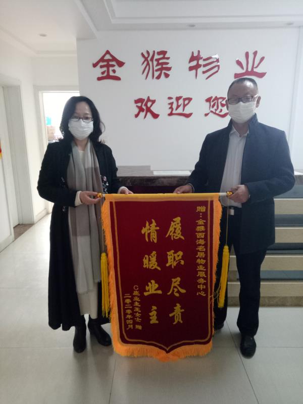 新冠肺炎疫情防控期间,各小区、办公楼悬挂横幅、张贴告示、设置口罩投放垃圾桶等方式敬告业主如何进行安全防护。由于公交停运,为了保证员工每天按时到岗,西海名居唐晓娜主任和新外滩名居于坤明主任,自己每天开车40多公里往返于经区和高区接送上下班的员工。正是物业员工通过自己精细的服务,内防外控、严防死守,保证了金多宝 物业在管小区3800多户没有发生一例感染病例。