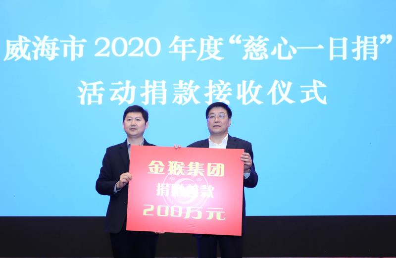 颁奖典礼结束后,威海市2020年度“慈心一日捐”活动捐款仪式举行,集团纪委书记、工会主席邹晓伍代表公司向市慈善总会捐款200万元。
