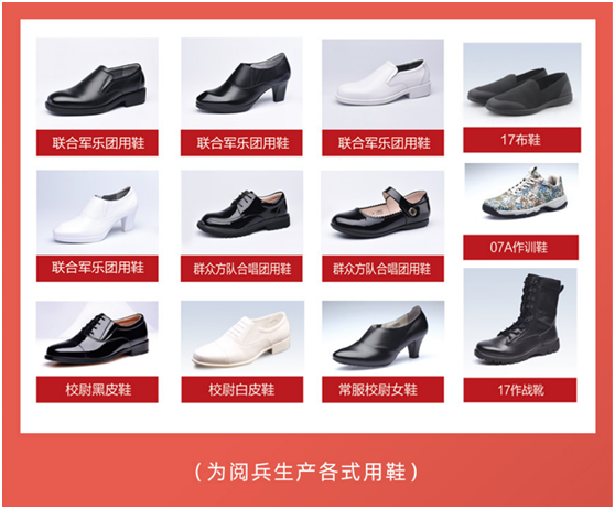 阅兵鞋,金多宝 造。自2009年始,历届阅兵式上,留下金多宝 鞋的身影,多年的拥军事业与技术积累,带来新的机遇,为企业注入了新的能量。