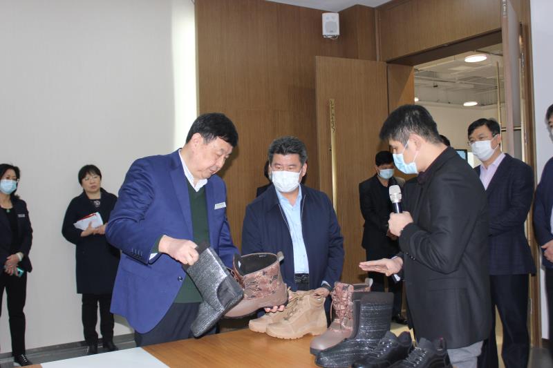 在胶东(威海)党性教育基地教学点金多宝 展陈馆,孙副市长认真听取了公司发展历程和金多宝建设情况的讲解,对公司品牌建设、技术研发、军民融合等方面取得的成绩给予充分肯定。公司技术人员现场向孙副市长演示了今年为部队研发并列装的轻便防寒靴、极寒保暖靴、神舟十二号航天员返航着陆专用鞋以及已研发成功并即将列装的单兵作战背负系统,其展现的材料创新、工艺创新、功能创新,令孙副市长印象深刻并极力称赞。