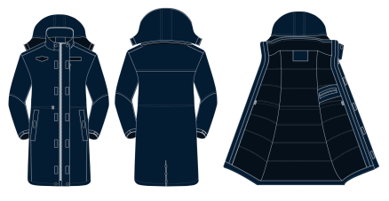 整体颜色为藏青色。款式为中长大衣款式。具有阻燃、防静电、防水、防风等功能。