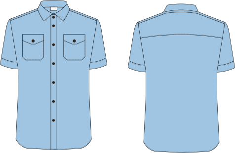 短袖施工服上衣不使用拉链,前门襟处由钮扣固定。上衣胸前直插口袋两个,领子为翻领结构,袖口、下摆做包边处理。